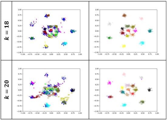 Conversely, when is larger than the number of modes, one mode may be covered by two or more generators, and one cluster may be labeled by two or more class numbers. Specifically, two generators (corresponding to the classes 8 and 15) try to cover the central mode in the case of , and the two classes 1 and 9, 8 and 10, 4 and 15, and 6 and 15 attempt to occupy a mode, respectively, in the case of . When , class 18 competes with class 15 to cover a mode, and classes 5, 10, 13, and 8 are compelled to cover blank areas between the modes. However, it can be clearly observed from Figure 8 that even in these situations, the model can stably converge and accomplish satisfactory mode division via accurate feature classification.