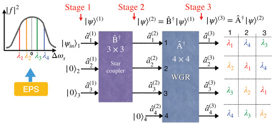 Figure 1 depicts our proposed scheme for entanglement distribution among four users via a waveguide grating router. A 3 × 3 star coupler (indicated by B ^ ) splits a broadband entangled signal equally into three parts as inputs of a 4 × 4 WGR (indicated by A ^ ). Thereby, the entangled signal produced by the EPS in stage 1 reaches stage 2 after passing the star coupler and finally distributes to users in stage 3 via the WGR as follows.