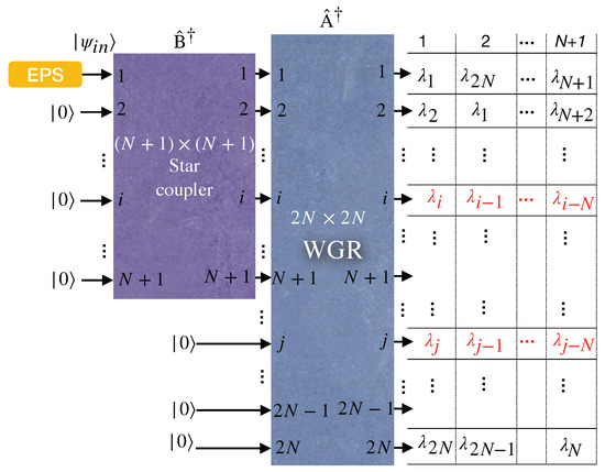 A generalized model of entanglement distribution for 2 N users is illustrated in Figure 2. This generalized scheme inserts a broadband polarization-entangled photon source into an ( N + 1 ) × ( N + 1 ) star coupler from its first input port. Subsequently, a WGR distributes N + 1 out of 2 N different wavelengths in the EPS spectrum to each subscriber, as depicted on the right-hand side of Figure 2. Consider the ith user with the wavelength set as