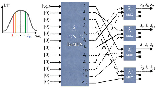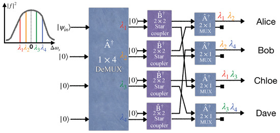 Table 1. Comparison of the entangled-based QWDM networks presented in this paper and the references [33,34]. The number of users is specified by N. Because ideal multiplexers, demultiplexers, and WGRs have the same mathematical model, their matrix elements’ value is assumed to be equal and represented by | A | . The matrix elements’ value of the n × n balanced star coupler is indicated by | B n | = 1 n .