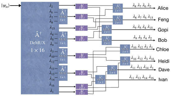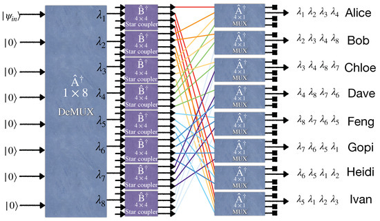 Figure 4. An entanglement distribution network between eight end users via broadband entangled photon sources utilizing a wavelength demultiplexer, eight 4 × 4 beam splitters, and eight multiplexers.