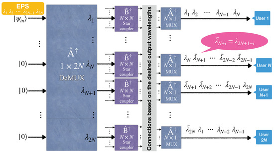 Figure 5. Schematic configuration of a quantum entanglement distribution network for 2 N users based on wavelength DeMUX (demultiplexer) and MUX (multiplexer).