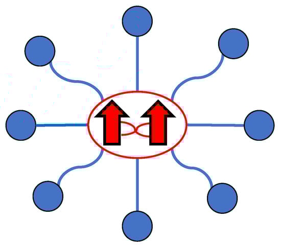 Schematic representation of the two-qubit spin-boson model. The two central arrows represent the two interacting qubits. The quantum harmonic oscillators constituting the bath are represented by the blue circles.