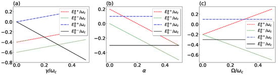 Dependence of the eigenenergies (dashed red line), (dotted green line), (dot-dashed blue line), and (solid black line) on the dimensionless (a) spin–spin coupling , (b) spin–bath coupling , and (c) the (classical) magnetic field strength .