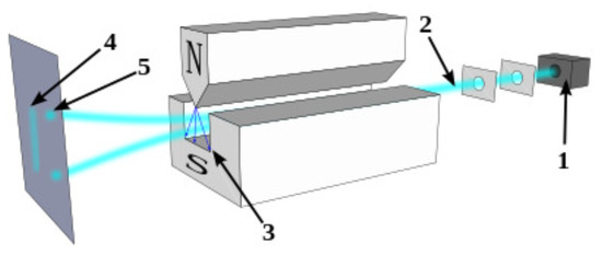 A schematics of Stern–Gerlach experiment. Neutral particles travelling through an inhomogeneous magnetic field, and being deflected up or down depending on their spin; (1) particle source, (2) beam of particles, (3) inhomogeneous magnetic field, (4) classically expected result (neglecting the quantum spin force), (5) observed result.