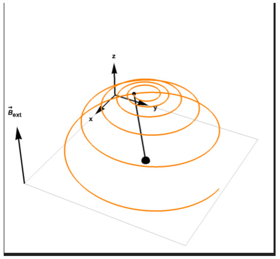The evolution of magnetization towards relaxation, the tip of the magnetization vector is described by the orange line.