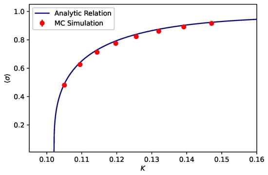 In this work, we have studied spontaneous magnetization for the FCC Ising lattice and have obtained an expression as given in Equation (10). To show the relevance of the analytic relation, we have also performed an MC simulation. The results of both the MC simulation and Equation (10) have been plotted in Figure 3, where the solid line (blue) and filled marker points (red) correspond to the results of the analytic relation and those derived from the MC simulation, respectively. As can be seen in Figure 3, there is a minute difference between the centers of the filled points and the solid line. Since the resolution of the figure does not allow for the viewing of error bars, there is no information as to whether the solid line passes through the error bars of the filled points or not. Consequently, we do not have strong evidence to support the claim that there is an inconsistency between these results. We, therefore, simply interpret that these results are nearly consistent with each other due to the fact that the solid line intersects with the filled points. On the other hand, if there is a deviation, this could either arise from the approximation we adopted in the derivation of the analytic relation as given in Equations (7a) and (7b) or from the inherent drawbacks of the MC simulations such as finite size effects. Nevertheless, in the MC simulation, we set the lattice size to , which is a highly sufficient lattice size to minimize this effect as reported in Ref. [100]. Therefore, as further work, one may clarify these points that we stressed out by calculating the values empirically through an MC simulation. This could be simply realized by recalling Equation (4) in the form
