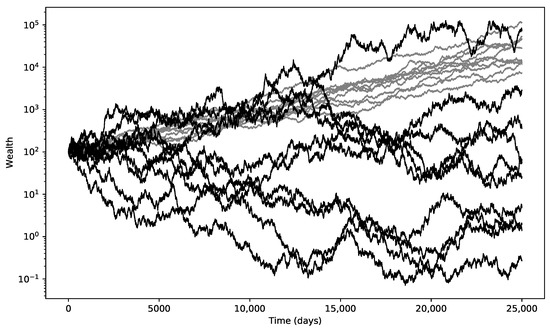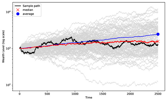 The results of the simulation for the 2-point distribution for different levels of initial risk can be found in Table 2. Unsurprisingly, we note that the highest median value is achieved at an initial risk of 10%. As the expected value of the return factor is positive, the average level keeps increasing with the amount of leverage or initial risk applied; this happens because there is a very small number of paths that contribute to the majority of the average wealth. For illustration purposes, we consider the expected return at an of 25%: . The expected growth rate over time, also labeled the time-average growth rate, equals: . (This explains our focus on the median level rather than the average level of the final wealth outcomes for the remaining experiments. Peters [35] provides a thorough discussion on the difference between expected return and time-average growth).