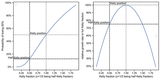 Thorp [23] concludes that most people strongly prefer the increased safety and comfort of a fractional Kelly position in exchange for giving up 25% of their growth rate. While there are many assumptions underlying this method, such as the normal distribution of returns and the assumption of the reinvestment of profits, it does show an interesting relationship between risk and growth over time. Several researchers [24,25] also discuss the relationship between Kelly optimal trading and drawdown risks.
