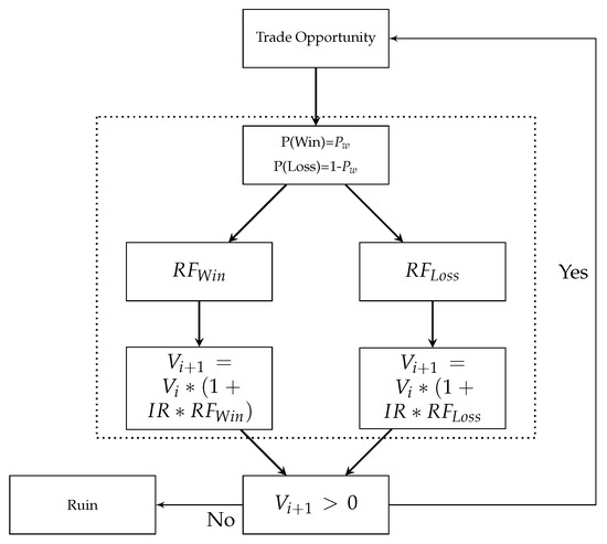 After each trade event, the account value V is checked. In the event the value is greater than 0, the process of exploiting new trading opportunities is continued. In the event the value is below or equal to 0, the risk taker faces ruin, and risk-taking operations are stopped.