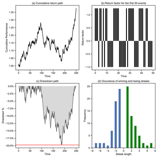 Figure 5 provides an example to illustrate the concepts identified above. It shows a simulated cumulative performance path, assuming 250 trading events over a 5-year period, an IR of 1%, a win rate of 50%, and a return outcome of +1.25% in case of a win and −1% in the case of a loss. Panel (a) shows a single simulated initial cumulative return path. Panel (b) shows the returns for each consecutive risk event over time. As defined before, approximately half of the outcomes are wins and half are losses. Another critical metric highlighted in panel (c) is the drawdown path. The drawdown refers to the difference between the highest cumulative performance over a given period and its subsequent value. The maximum drawdown is the largest of all these drawdown values. A thorough analysis of drawdowns provides a comprehensive review of the risks inherent in a trading operation. Finally, we count streaks of consecutive wins and losses in panel (d). There are no surprises in the middle, as there is an almost equal amount of alternating wins and losses. The tails show some interesting observations, such as two sequences of 7 consecutive losses and wins.