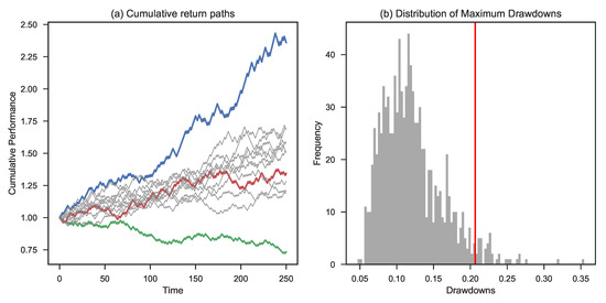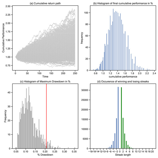 Simulation of 1000 cumulative return paths: Panel (a) shows the cumulative return path for each specific simulation. Panel (b) shows the distribution of the final outcomes of each simulated process, with most of the final performances ranging between 0 and 80%. Panel (c) shows the distribution of the maximum drawdowns related to each performance path; after visual inspection, we note that most of the drawdowns are between 5 and 20%. The red line shows the -level. Panel (d) is based on an analysis of winning and losing streaks over the entire set of simulations. For each simulation, we count the occurrence and length of losing (blue color) and winning streaks (green color).