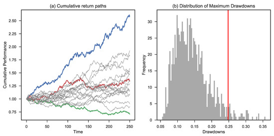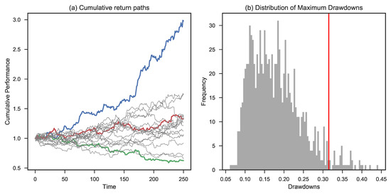 Figure 7 zooms in on the 1% initial risk level. Panel (a) shows the highest, lowest, and 50th percentile path (ranked based on final outcomes) along with a range of different simulated paths. Panel (b) provides the empirical distribution function of the maximum drawdown of each individual path. The red line shows the level of 21%. This means that the average of the 10% worst maximum drawdowns equals 21%. The ensemble average of maximum drawdowns is 12% in this case.