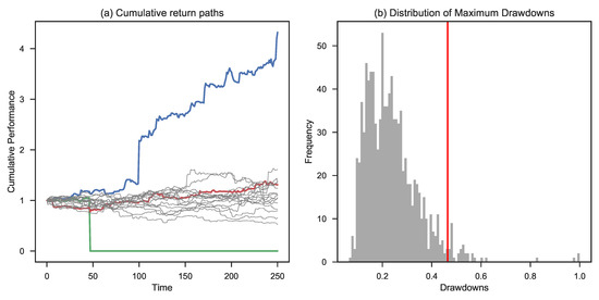 Simulation based on an exponential return factor with an initial risk of 1%. Panel (a) shows the highest (in green), lowest (in blue), and 50th percentile final wealth trajectory (in red). Panel (b) shows the maximum drawdown distribution and the corresponding (in red).