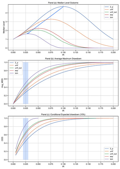 Figure 11 provides a summary of the different experiments for the median level outcome, the average maximum drawdown, and the . This graph shows why cautiousness in the face of uncertainty is so important. First, we note that additional randomness and more extreme possible return factors lower the expectation for the median level outcome and lead to lower optimal IR taking. The blue arrow in panel (a) highlights the critical impact of tail risk within the outcome distribution. At 10% initial risk (), we obtain the highest median level for the 2-point distribution. For the uniform distribution with outliers, we note that the highest median level is achieved at an below 5%. The heaviest tailed distribution, represented by the Lomax distribution, reaches its peak growth at an level of around 2.5%. These observations are in line with the Kelly criterion and a direct consequence of the impact of randomness on the ability to assume risk and generate favorable outcomes.