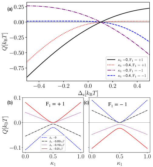 In Figure 2, we investigate the heat Q, extracted from the heat bath, as a function of the qubit–qubit coupling strength for different values of and feedback strategies (Panel (a)) and as a function of the measurement strength for different values of (Panel (b) corresponding to feedback and Panel (c) to ). In the case of decoupled-qubits, i.e., , we know that heat extraction can be obtained only with [63], since would increase the energy of the qubit, resulting in heating the baths, rather than cooling them. However, for finite , we observe that positive heat extraction can be obtained even with (see the solid black and dotted red curves in Figure 2a). The heat extraction, in this case, is obtained when . The behavior above can be explained by considering that the energetics of the coupled systems is influenced by . Note that, for a suitable choice of feedback, the heat extraction is an increasing function of in the considered parameter regime. In Figure 2b,c, we observed that, for , i.e., when the demon acquires no information from the measurement, the qubit dissipates heat to the bath for all values of . Since no information is obtained, the demon has no resources to extract heat from a single thermal bath. Conversely, the maximum heat is extracted from the bath when , which corresponds to maximum information extraction (the demon performs a projective measurement and feedback). Comparing Figure 2b,c, we observed that changing the feedback strategy from +1 (Panel (b)) to −1 (Panel (c)) or vice versa changes the sign of heat extraction.