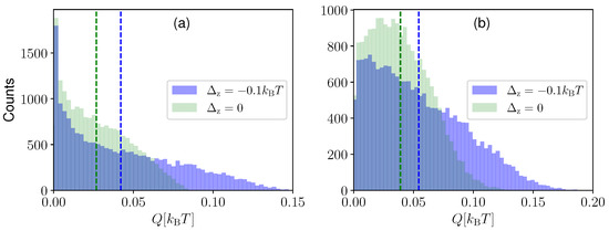 Count distribution of the heat extraction for one-qubit continuous measurement (Panel (a)) and the two-qubit combined continuous measurement (Panel (b)) for . The dashed lines indicate the averages of the distributions. The simulation is performed for sequential measurements with feedback application only at the end. The distributions are for 20,000 simulations. As feedback, we applied in the left panel and in the right panel. We take the same parameters as Figure 2 for .