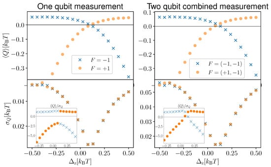 In Figure 5, we compare the extracted heat distribution in the one-qubit measurement case (Panel (a)) and in the combined measurement case (Panel (b)) for N = 20,000 simulations of the heat extraction processes and for in the left panel and in the right panel. Each simulation was obtained by performing feedback after sequential measurements each of duration . Interestingly, in the case of a one-qubit continuous measurement, we found that the engine is more likely to extract zero heat, and the probability of extracting heat decreases monotonically with Q. However, in the combined measurement case, a finite amount of heat (whose magnitude depends on the value of ) is extracted more often than zero heat. The distribution in green is for the case when the two qubits are decoupled, whereas the blue distribution gives the finite coupling case . We observed that the coupled system produces a larger average heat extraction (blue dashed line) compared to the decoupled system (green dashed line). However, the greater average heat extraction is accompanied by larger fluctuations, as observed from the broader width of the probability distribution for . This can also be observed in Figure 6, where we plot the average heat extraction (upper panels) and the fluctuation quantified by the standard deviation (lower panels), as a function of . The panels on the left-hand side are for the one-qubit measurement case, whereas the right-hand side corresponds to the two qubits combined measurement case. We observed that the standard deviation reaches a minimum when the average extracted heat goes to zero. In addition, fluctuations are present both when the system is cooling and heating the environment. The maximum fluctuation is observed when the average heat extraction takes the maximum value. From the inset, we observe that the ratio between the average heat extracted and its standard deviation shows a maximum as a function of in the regime. Comparing the one-qubit measurement and two qubits combined measurement cases, we observed that, although combined measurement gives better average heat extraction, it is also associated with larger fluctuations.