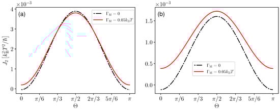 Heat current flowing out of the cold bath as a function of the rotation angle for (Panel (a)) and (Panel (b)). We take , , , , .