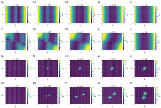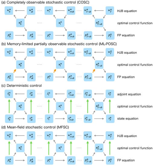 However, ML-POSC cannot be solved in a similar way as completely observable stochastic control (COSC), which is the most basic stochastic optimal control problem [15,16,17,18]. In COSC, the optimal control function depends only on the Hamilton–Jacobi–Bellman (HJB) equation, which is a time-backward partial differential equation given a terminal condition (Figure 1a) [15,16,17,18]. Therefore, the optimal control function of COSC can be obtained by solving the HJB equation backward in time from the terminal condition, which is called the value iteration method [19,20,21]. In contrast, the optimal control function of ML-POSC depends not only on the HJB equation but also on the Fokker–Planck (FP) equation, which is a time-forward partial differential equation given an initial condition (Figure 1b) [14]. Because the HJB equation and the FP equation interact with each other through the optimal control function in ML-POSC, the optimal control function of ML-POSC cannot be obtained by the value iteration method.