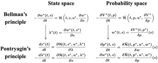 In this section, we obtain the optimality conditions of ML-POSC by employing Pontryagin’s minimum principle [22,23,24,25] on the probability density function space (Figure 2 (bottom right)). The conventional approach in ML-POSC [14] and MFSC [30,31] can be interpreted as a conversion from Bellman’s dynamic programming principle (Figure 2 (top right)) to Pontryagin’s minimum principle (Figure 2 (bottom right)) on the probability density function space.