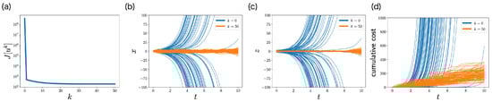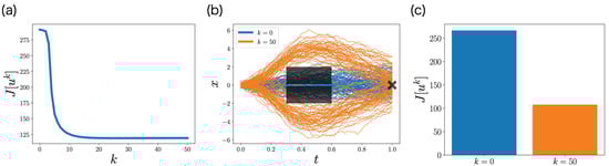 This result is consistent with the conventional result of COSC [15,16,17,18]. Unlike ML-POSC and MFSC, COSC can be solved by Bellman’s dynamic programming principle on the state space. In COSC, Pontryagin’s minimum principle on the probability density function space is equivalent to Bellman’s dynamic programming principle on the state space. Because Bellman’s dynamic programming principle on the state space is a necessary and sufficient condition, Pontryagin’s minimum principle on the probability density function space may also become a necessary and sufficient condition.
