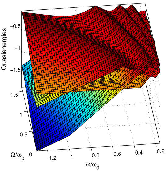 The quasienergies can be obtained from the numerical diagonalization of the quasienergy operator (9) [or equivalently (11), apart a change of energy reference], as shown in Figure 1. We emphasize that the quasienergies do not depend on the number of cycles considered . The complete spectral information is contained in one Floquet zone composed of two surfaces within a given band of energy of width . The other surfaces can be constructed using the periodicity of the spectrum: , for any (positive or negative) integer k. In Figure 1 we display a few surfaces. Figure 2 shows cross-sections, one for a constant (left frame) and for constant (right frame). Around the one-photon resonance (for ), one can recognize the surfaces of Figure 1 of Ref. [17]: For , the horizontal line of energy corresponds to the lower state of the system , with the notation for the bare state dressed with k photon, i.e., the state with . The crossing line (at ) corresponds to the upper state dressed with minus one photon . One can distinguish in the plane resonances appearing as crossings at with For , they become avoided crossings. For , we have exact crossings for any , due to the particular symmetry of this model (one can see an example for ). This means that only odd numbers of photons can be absorbed (or emitted) in such a system. The maxima of the upper surface correspond to crossings (for any ), and the valleys to avoided crossings (i.e., to resonances). One can observe that for increasing , the position of the resonances are shifted in the direction of larger . This can be interpreted as a Stark shift of the states. This implies that moving along a straight line with for growing allows one to cross dynamically the three-photon resonance, next the five-photon resonance, and so on, as shown in Figure 2. The three-photon resonance avoided crossing represents thus the first dynamical obstruction that can prevent the control of population transfer by a standard chirped pulse for a large enough Rabi frequency.