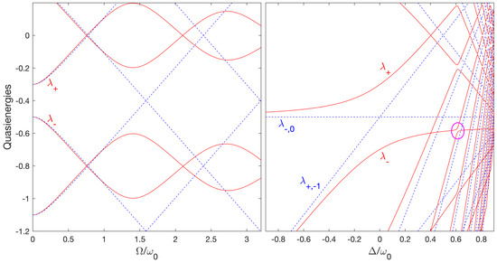 Cross section (full lines) of the quasienergy surfaces (in units of ) of Figure 1 as functions of (i) for a constant , i.e., , where the dashed lines are the quasienergies in the resonant approximation (left frame); (ii) for a constant (full line) and (dashed lines) (right frame). One can distinguish the three-photon resonance as an avoided crossing located around (left frame) and identified by a circle (right frame). The five-photon-resonance avoided crossing can be seen around (left frame).