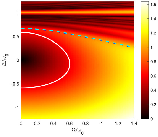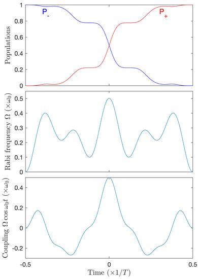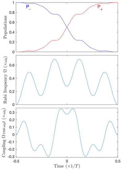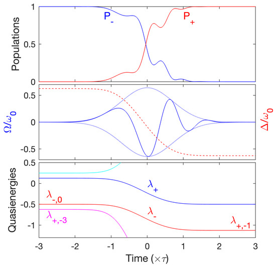 Adiabatic passage through the (one-photon) resonance, using a pulsed (symmetric) Rabi frequency with the peak value and the shape , with , , and of characteristic width , and a chirped frequency , of characteristic width around the resonance , requires in general . The chirped frequency induces for the full coupling in Equation (1) the phase , which can be rewritten as a function of the detuning; see Equation (2): . We consider smooth Gaussian pulses , which allows in principle a transfer exponentially accurate as a function of the pulse duration [38] (see Appendix A.2). Defining (with a larger ensuring a better adiabatic passage) leads to . This shows that adiabatic passage, for a given , breaks more strongly the rotating wave approximation for a smaller number of cycles, since gets closer to . This requires to take into account the full quasienergy operator.
