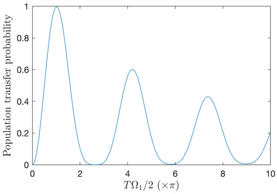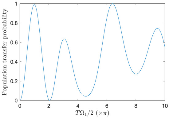 with the sign + (−) for (), i.e., [] the initial (final) detuning, respectively. We remark that, in the RWA, the symmetric situation: the sign − (+) for (), i.e., [] the initial (final) detuning, respectively, leads to the same population transfer. As mentioned above, the quality of adiabatic passage can be evaluated by the value of . It has been shown in [39,41] that Gaussian-pulse parallel adiabatic passage mainly features (i) high fidelity (corresponding to population transfer with a deviation from the perfect transfer of the order ) for the product as low as , (ii) a narrow perfect transfer for , and (iii) ultrahigh fidelity for .