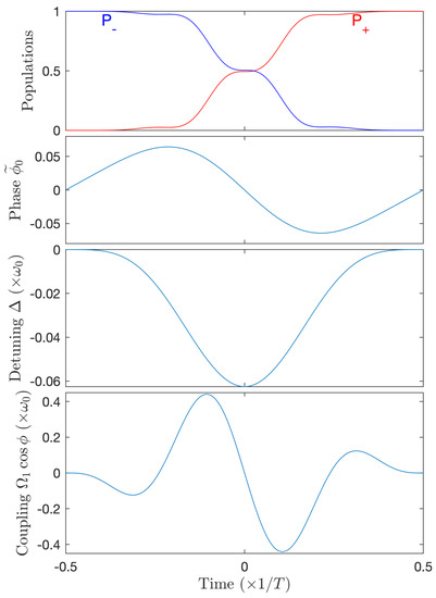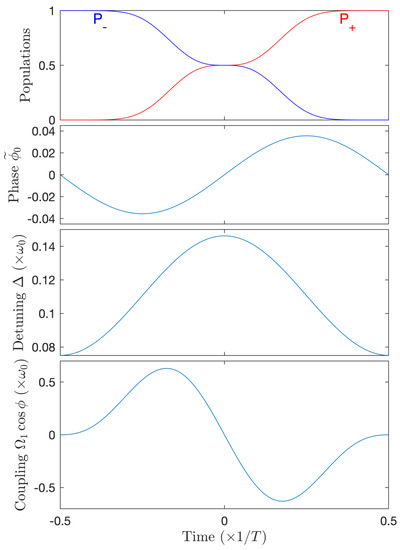 - Guérin, S.; Thomas, S.; Jauslin, H.R. Optimization of population transfer by adiabatic passage. Phys. Rev. A 2002, 65, 023409. [Google Scholar] [CrossRef]