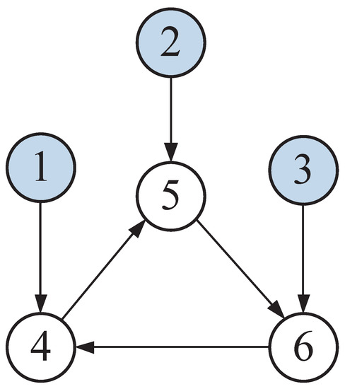 Consider a six-node graph network connected by three leader nodes. The directed topology of the graph is displayed in Figure 2.