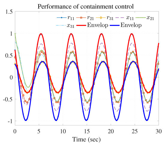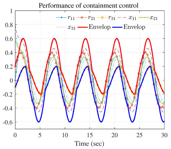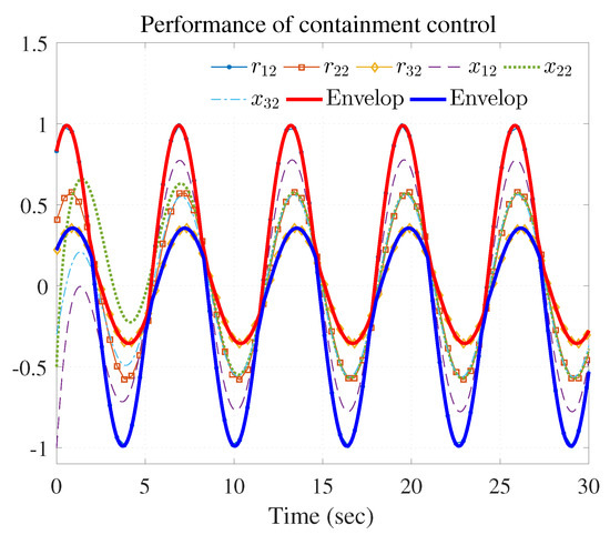 Figure 7, Figure 8, Figure 9, Figure 10 and Figure 11 show the simulation results. The local neighborhood containment errors converged to a small region around zero as depicted in Figure 7, which shows that the containment control of the nonlinear MAS was achieved. In Figure 8 and Figure 9, it can be found that the state trajectories of single-link robot arms (36) entered and stayed within the region enveloped by the leader nodes as the time progressed, which indicated the satisfactory performance of the developed scheme. The evolution curves of all agents are illustrated as the 2-D phase plane plot in Figure 10. We can see that the convex hull formed by the leaders and contains the followers at the time instants and , which implies that the followers converged to the convex hull. Figure 11 describes the curves of the containment control inputs, which shows the regulation process of the containment error system.