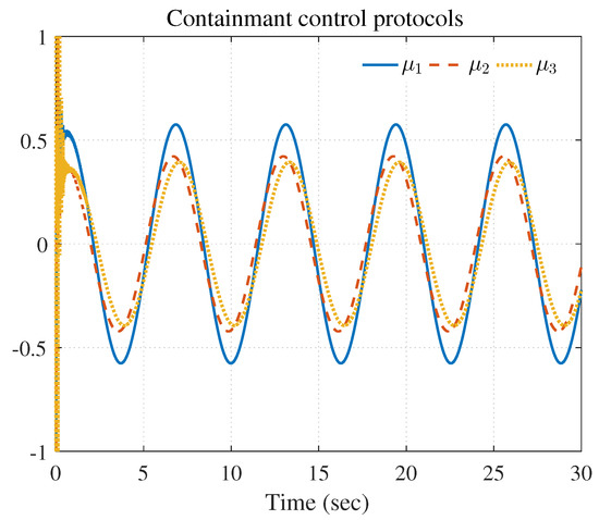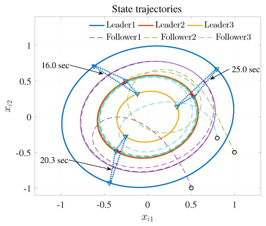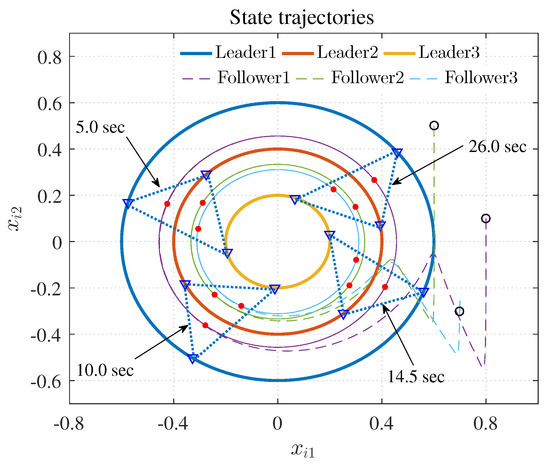 As displayed in Figure 2, nodes 1–3 stand for the leaders 1–3 and nodes 4–6 represent the followers 1–3. In (3), the edge weights and pinning gains were set to 0.5. The node dynamic of the jth leader is described as , where represents the state vector, and