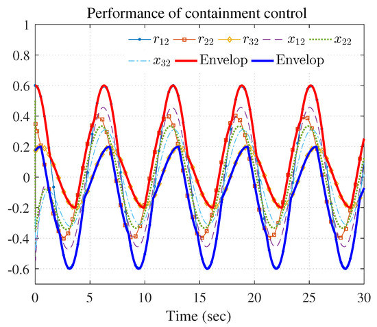 The simulation results are shown in Figure 3, Figure 4 and Figure 5 using the developed IRL-based OCC protocols. The evolution procedure of the local neighborhood containment errors for triple followers is shown in Figure 3, which indicates that the local neighborhood containment errors were regulated to zero under the developed control protocols. Thus, the containment control of MAS could be reached. Figure 4 and Figure 5 depict the state curves of the leaders and the followers, where all followers moved and stayed within the region formed by the envelope curves. It implies that the satisfactory performance of the containment control was acquired. The state curves of the followers and the leaders are displayed as 2-D phase plane plot in Figure 6 and the region enveloped by the three leaders and is shown at three different instants ( and ). We can observe from Figure 6 that the followers converged to the convex hull.
