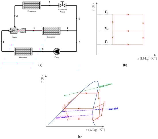 For the ideal cycle, all the processes are reversible. Its coefficient of performance (COP) is only related to the temperatures of the heat source, heat sink, and cold media. While for an actual ERC, there are different kinds of irreversible losses in it, most of which are related to working fluids. Moreover, its COP is not only related to the working conditions, but also to the working fluid properties. Since French engineer Maurice Leblanc introduced the steam ejector refrigeration system in 1910 [4], ERCs have been continuously developing for more than a century. In the past hundred years, a huge number of refrigerants have been applied in ERCs. In the early 1900s, the working fluid was mainly water. Since the 1930s, halocarbon refrigerants have been extensively researched in ERCs both theoretically and experimentally. For example, R11 [5], R12 [6], R113 [7], R123 [5], R134a [8], R141b [9], R142b [10], R152a [11], and R245fa [12]. As the Montreal Protocol on substances that deplete the ozone layer was ratified in 1987, scholars turned their research to natural refrigerants and hydrocarbon refrigerants, such as water [13], ammonia [14], R290 [15], R600 [16], R600a [17], etc.