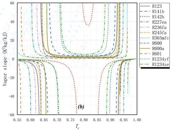 The saturated vapor slope β of 15 pure fluids is shown in Figure 2. For wet fluids, the slope decreases first and then increases as the reduced temperature Tr (Tr= Ts/ Tcr) increases from 0.555 to 0.995. They all get a minimal value as Tr is about 0.82. For isentropic fluids and dry fluids, there are two pole points. The slope decreases first and then increases as Tr increases between these two points, but it decreases as Tr increases when it is outside this range.