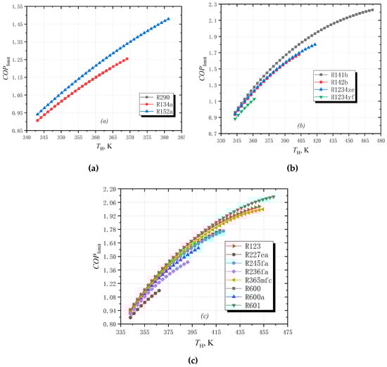 Figure 5 shows the variation in COPlimit at different high temperatures for these fluids. As can be seen, when TH increases from 343.15 to 400.15 K, COPlimit increases. This is because when TH increases, the temperature difference between the middle temperature and high temperature rises. According to Equation (22), the limiting COP increases.