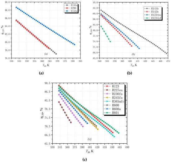 The order of ηLTP remains the same compared with that of COPlimit for all fluids. The difference in ηLTP is caused by that of COPlimit. Therefore, ηLTP has similar variation law of COPlimit. For the wet fluid group, the order of ηLTP is R152a>R134a>R290. For the isentropic fluid group, the order is R141b>R142b>R1234ze>R1234yf. For the dry fluid group, the order is R123>R601>R365mfc>R600>R245fa>R600a>R236fa>R227ea. R152a, R141b, and R123 perform best in each group, respectively. The order of ηLTP is R141b>R123>R152a, with the value of 86.8%, 84.90%, and 83.67%, separately.