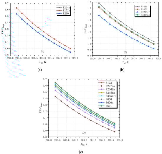 Figure 7 and Figure 8 show the effect of middle temperature TM on the limiting performance of ERC. It can be seen from Figure 7 that when TH increases from 298.15 to 308.15 K, COPlimit decreases for all fluids. When TM increases, the temperature difference between middle temperature and low temperature increases. Consequently, the efficiency of the refrigeration part decreases according to Equation (27). At the same time, the temperature difference between the middle temperature and high temperature is reduced, which leads to a reduction in the efficiency of the cycle driving part. Therefore, the efficiency of the entire refrigeration cycle decreases.