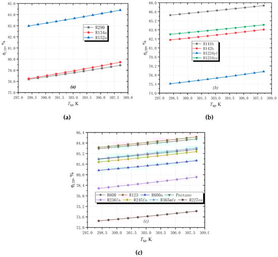 As shown in Figure 8, when the middle temperature increases, the thermodynamic perfection for all fluids decrease. When TM increases, the temperature difference between high temperature and middle temperature decreases. As a result, the irreversibility in the subcooling section of the working fluid decreases accordingly.