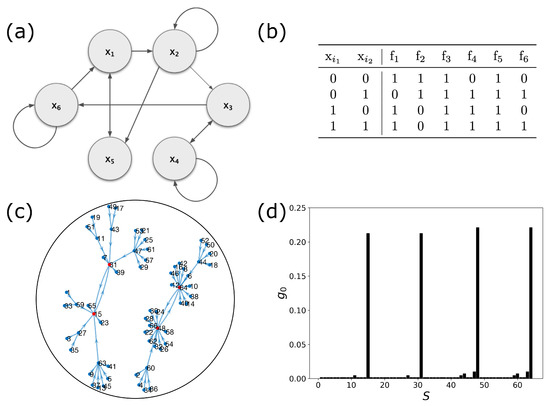 A 6-gene network with , and the bias of . (a) Wiring diagram of the network. (b) Truth table of Boolean functions. (c) State transition diagram. (d) Steady-state distribution, , with perturbation .