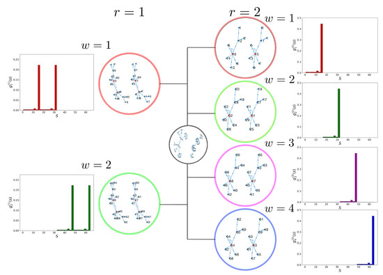 Phase transitions can be studied in terms of the order parameters , where . Note that for each r there are , where unique fraction differences. Although this computation is manageable for , it becomes increasingly difficult to solve for . In an ongoing project, we attempt to classify the phase transitions presented in Figure 4 and Figure 5 and compute the corresponding critical exponents. Preliminary results indicate that partial construction of the Waddington epigenetic landscape [43] is possible. Specifically, one can derive the quasi-potential , where is the joint probability distribution of all [44,45]. Note that this scalar function is defined in an -dimensional space. This construction can be simplified considerably in cases where some transitions are not possible. For example, in the model BN for , the transitions from to and and from to and were not observable in the limited number of simulations performed for this section.