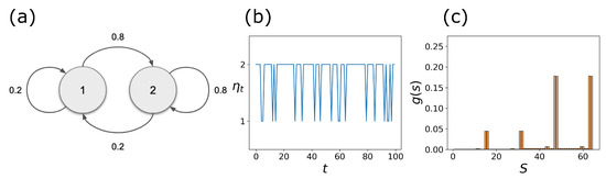 Stochastic pinning of the BN: (a) transition diagram for a two-state, , stochastic pinning process; (b) first 100 sampled values of the stochastic process ; and (c) steady-state distribution of the stochastic CK, , obtained after simulation steps.