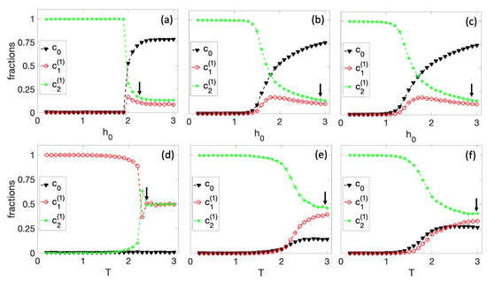 In the first set of simulations, shown in Figure 4, we fix . In Figure 4a–c, we kept the temperature constant at , , and , respectively, and varied the parameter . Specifically, we started with a high value of , where we expected the fraction of the original cell to be dominant and gradually reduced it to . For , the initial conditions of all nodes in the tissue were randomly chosen. The final state of this simulation is the initial condition for the next value of the local field , and so on. For high values of , we see that is the most dominant fraction in the colony. As decreases, drops to a critical value where spontaneous differentiation occurs. An arrow in Figure 4 approximately indicates the starting point of the differentiation process. Note that the system always differentiates to the cell. This decision is related to the structure of the original BN. As seen in Figure 1d, the steady-state distribution is slightly higher in the second half of the state space, and this small difference always favors . However, different BNs may exhibit alternative phenotypic behaviors. This transition is smooth for high temperatures ( and ). However, the differentiation seems rather steep for low temperatures ().
