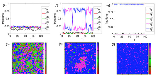 Next, we illustrate the cell-to-cell variability in the system. As an example, we used the parameters of Figure 5e and plotted the time evolution of the cell fractions, as well as representative snapshots at three different temperature points: , , and (Figure 6). At temperature , precisely before the first differentiation, all types of cells co-exist throughout the simulation time (Figure 6a). The snapshot in Figure 6b illustrates this high level of cell variability. At (Figure 6c), where the second differentiation occurs, the system fluctuates significantly between and . This fluctuation resembles the features of the second-order phase transition observed in 2D Ising models. In support of this assumption, the snapshot of Figure 6d shows the characteristic fractal-like structure of island sizes in a sea of cells. At low temperature , the second differentiation has already taken place, and the decision to differentiate to cell was made for this particular simulation (Figure 6e,f). It must be underlined that, for this specific BN, the original cell can differentiate equally between the and .