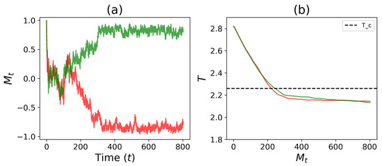 Simulations of a Ising model with a self-tuning feedback equation (Equation (8)). Here, , , and . (a) Magnetization trajectories show two systems are driven to immediately upon initialization and eventually self-tune to two different homogeneous cell types ( or ). (b) The simulations show that the temperature drop slows as it descends below the critical temperature () and eventually reaches a steady temperature. Combining (a) and (b), we see that as the feedback temperature reaches the Ising critical temperature (), the magnetizations begin to diverge and tissue differentiates homogeneously to one of the two possible cell types. The time unit is MC steps with .