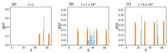 Observing tissue-level statistics provides additional insight into collective behaviors in pluripotent cells transitioning to two possible cell types. A total of 100 independent and identical tissue simulations of Figure 7 were carried out, and instantaneous state distributions and the average gene state (mean of a whole tissue) were collected at each time step. At the beginning of the simulation, , the system was initialized with a high temperature point () and with the CK fixed to , as in Figure 7. Trivially, all cell states are in , and the average gene state, which describes the tissue-level distribution, is unimodal (Figure 8a). At time , where the system reaches , two different cell types are probed, resulting in a mixture of and cell types, while the average state at the colony level remains unimodal, centered between and (Figure 8b). With time, the temperature self-tunes and reaches an equilibrium point below the critical temperature (). At time , approximately half of the tissues form a homogeneous cell type of , and the other half form a cell type . The tissue-level states reach a split bimodal distribution (Figure 8c). The system describes a full transition from a population of pluripotent tissue to two differentiated cell types. At the tissue level, this unimodal–bimodal transition at the critical junction of the phase transition occurs in several areas from mouse embryogenesis [12] to the development of cancer cell line [47].