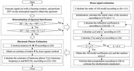With a large amount of renewable energy and nonlinear loads connected to the grid, harmonics and interharmonics are becoming increasingly abundant, posing a great threat to the safe and stable operation of the grid [,]. On the one hand, some large industrial equipment can generate dense interharmonics (DIs) with close frequencies []. At the same time, many harmonic components are considered as interharmonics due to the asynchronous sampling []. When these signals are mixed together, serious spectral interference is generated, leading to distortion of the measurement of harmonic parameters. Therefore, it is significant to study the estimation method for harmonic phasor under DI interference.