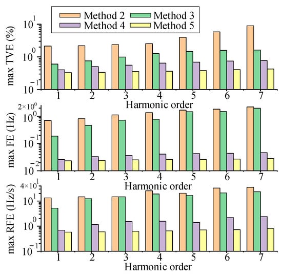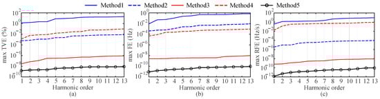 where f0 is set to 50 Hz, φ1 and φh are set to random numbers uniformly distributed between (0, 2π). The amplitude of each harmonic is set to 10% of the fundamental amplitude. According to [,], harmonics after the 13th order in the utility grid have a low proportion of the fundamental. Therefore, the maximum number of harmonics in the simulation is 13. The sampling frequency is 5 kHz and the length of the window function is 6 fundamental periods. In the subsequent simulation analysis, the length of the window function will be kept constant at 0.12 s. Because it is suitable for the dynamic characteristics of varying network signals. The signals shown in (25) are detected using Methods 1 to 5, respectively. Figure 3 shows the maximum TVEs, FEs, and RFEs for each method, where the harmonic order of 1 indicates the fundamental wave.